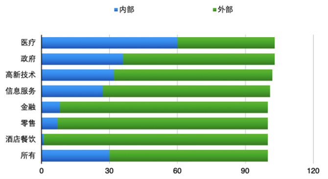 从Verizon报告可以看出医疗行业数据安全的特殊性:医疗行业是所有行业中唯一一个内部威胁大于外部威胁的行业,内部威胁占比60%,外部威胁占43%。总体来看,各行业平均攻击类型是:70%为外部威胁,30%为内部威胁。下图就数据泄露的几个主要行业做了对比,包括:医疗、金融、政府、信息服务、制造业、零售、酒店餐饮。