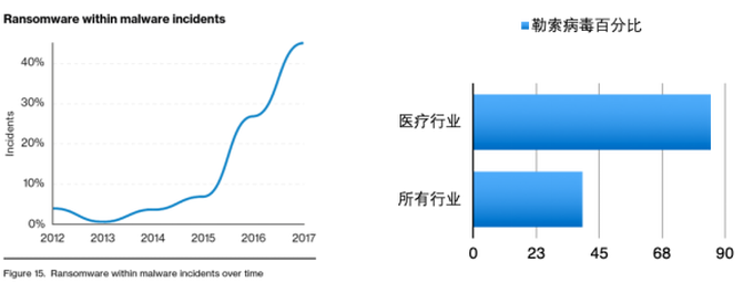 勒索病毒是医疗安全的主要威胁。Verizon数据威胁报告显示,在医疗行业,高达85%的恶意软件面临勒索病毒威胁。Verizon报告特别强调,为了获得更多的收益,勒索者越来越倾向于企业级服务器,特别是数据库服务器,是核心勒索目标。基于Verizon报告我们可认为,只要成功防御了勒索病毒威胁,医疗数据外部安全风险就获得了相对安全。